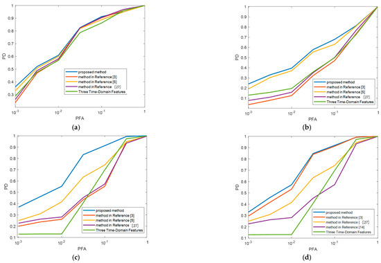 ROC curves of various feature combinations in the proposed method and the methods in references [3,5,27] and the three time-domain features. (a) sea state 4 (b) sea state 5 (c) airborne test data 8 (d) airborne test data 9.