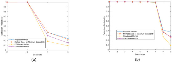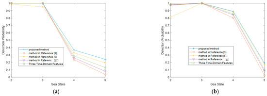 Detection probability for different sea conditions in the proposed method and the methods in references [3,5,27] and the three time-domain features. (a) HH polarization, (b) VV polarization.