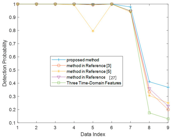 Detection probability for different grazing angles and in the proposed method and the methods in references [3,5,27] and the three time-domain features.