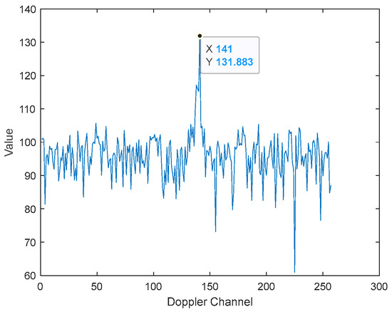 In this context, and denote the power spectra of the target and clutter, respectively, while K corresponds to the frequency point at which the simulated target is located. Figure 30 shows the Doppler spectrum of the target cell after adding the target, with a cumulative pulse count of 256. It can be seen that the energy of the added target is concentrated in the 141st Doppler channel.