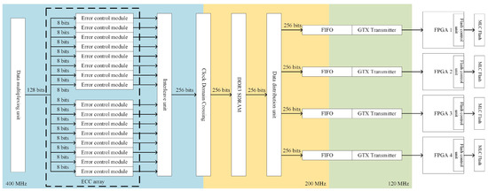 The core components of the system are composed of a data multiplexing unit, an ECC array, an interleaving unit, a DDR3 high-speed cache, a data distribution unit, GTX transceivers, and four storage units, as illustrated in Figure 1. The data multiplexing unit is responsible for converting data from its original format to a standardized 128-bit format. The data multiplexing unit is required to be designed in a tailored manner to meet specific task requirements. Common hardware interfaces and transceivers for the collection of electromagnetic spectrum data include LVDS, Serdes, TLK2711, and GT-class. Based on these interfaces and transceivers, upper-layer protocols such as 8b10b, 64b66b, Aurora, and JESD204 can be implemented. The relevant interfaces must be supported by the hardware devices, and the corresponding protocols must be supported by the data multiplexing unit to ensure compliance with task-specific demands. As long as the data rate is maintained below the rated storage capacity of the S-SSR system and sufficient storage space is provided, data loss will not occur. The ECC array comprises 16 parallel error control modules. These modules operate under the RS(256,252) algorithm to enhance data reliability. Each module processes 252 characters of 8-bit width. Additionally, four fault-tolerant control characters are added, resulting in an expansion of the data to 256 characters. This error-checking mechanism is capable of correcting or identifying errors in up to four characters. The interleaving unit interleaves the 16 8-bit error control sequences from the ECC array. This process significantly enhances data transmission security. The DDR3 cache operates at an 800 MHz I/O clock frequency and a 32-bit I/O width. It provides a maximum data transfer rate of 51.2 Gbps. The data distribution unit is utilized to distribute data read from the DDR3 SDRAM to multiple storage units via GTX transceivers. Each storage unit is composed of an FPGA and its controlled storage area. The Flash control unit is designated as the primary functional unit on this FPGA. It manages the transfer of data from the GTX transceiver to the Flash storage area.