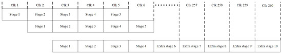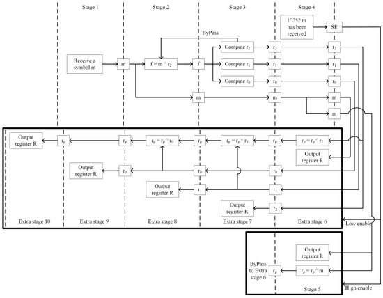 Detailed view of the 10-stage pipeline structure of the RS(256252) algorithm. This figure illustrates the implementation of the algorithm from Figure 2 in a pipelined architecture. The relevant code for this module has been open-sourced from Github (https://github.com/lixuf/ECC_array/tree/main (accessed on 1 January 2024)).