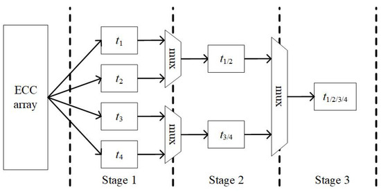 To ensure the data interleaving unit operates at a clock frequency of 400 MHz, a three-stage pipelined structure, depicted in Figure 5, is employed. Due to the 128-bit width of , selecting and outputting one transformation from four options within a single clock cycle would incur unacceptable logical delays. Hence, this selection process is divided into three clock cycles, forming a three-stage pipeline. The mux in the diagram serves as a selection unit, choosing between two inputs. Through the operation of the two-stage mux, , , , and are sequentially selected and outputted.