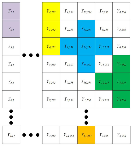 Four transformation methods—, , , and —are proposed for interleaving the ECC sequences, as shown in Equation (7). Sequentially transforming the symbol positions within using , , , and enables a spacing of 4 symbols. Specifically, upon obtaining the first output from the ECC array, it is transformed into and then outputted. Subsequently, after obtaining the second, third, and fourth outputs from the ECC array, each is transformed into , , and , respectively, and outputted sequentially. Thereafter, this process repeats with every four outputs forming a group, cyclically using the transformations , , , and .