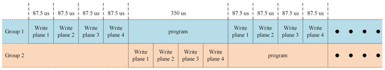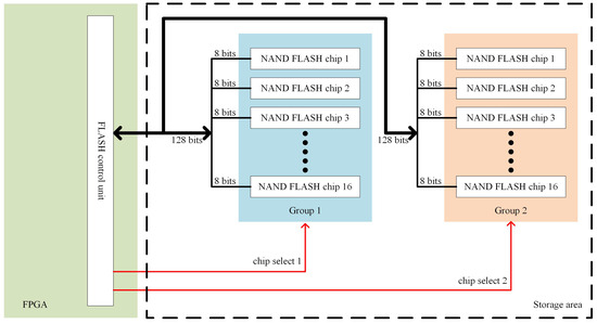 The FLASH storage area consists of 32 NAND FLASH chips. These chips provide a total effective storage capacity of 4 Tbit. Each chip is divided into four planes, and each plane can store 16 Gbit of data. The page size is 8 KB. The FLASH chips are divided into two groups that share a 128-bit wide data bus. Each group is activated by chip select signals, as shown in Figure 7. Specifically, when data equivalent to 64 pages are accumulated by the FLASH control unit, they are written into the cache registers of all planes in one group of FLASH chips. Each group consists of 16 FLASH chips, with each chip divided into 4 planes. Consequently, a total of pages is required to fill the cache registers of one group. Once the cache registers are fully written, a programming operation is initiated to transfer the cached data into the FLASH storage area. After the programming operation for one group is initiated, the FLASH control unit proceeds to the other group, where the process of cache writing and programming is sequentially repeated.