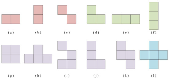Patterns of bit upset events, including double-bit, triple-bit, quadruple-bit, and quintuple-bit upsets. (a–c) Patterns of double-bit upsets. (d–f) Patterns of triple-bit upsets. (g–k) Patterns of quadruple-bit upsets. (l) Pattern of quintuple-bit upsets.