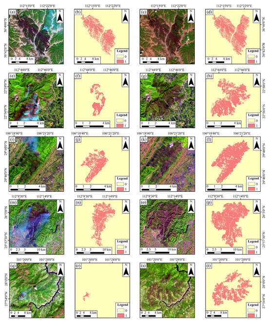 - Zhang, P.; Hu, X.; Ban, Y.; Nascetti, A.; Gong, M. Assessing Sentinel-2, Sentinel-1, and ALOS-2 PALSAR-2 Data for Large-Scale Wildfire-Burned Area Mapping: Insights from the 2017–2019 Canada Wildfires. Remote Sens. 2024, 16, 556. [Google Scholar] [CrossRef]