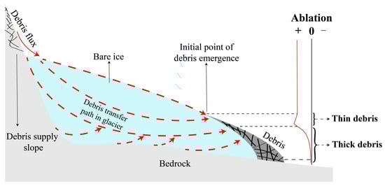 Schematic of debris sources (the ablation rate in the area above the boundary between supraglacial debris and bare ice is not constant but is shown to highlight the promoting effect of a thin debris cover on ablation).