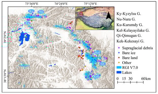 During the classification process, sample sites representing different land cover types (Figure 1) were selected through the visual interpretation of remote sensing images. These land cover types included supraglacial debris, bare ice, and bare land, alongside other types, such as vegetation, water bodies, and shadows. Seventy percent of the sample points were allocated for model training, while the remaining thirty percent were used to validate the classification accuracy [58]. This division ensures that the model effectively generalizes and produces consistent classification results across images from varying time periods. The sample points used can be found in the Supplementary Information.