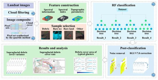 The spectral similarity among the supraglacial debris cover, exposed rocks, and sediments makes the predictions of traditional classification methods inaccurate [29]. As a consequence, land surface types cannot be effectively distinguished using a single feature [30]. To address this challenge, researchers have developed novel methods and incorporated additional features to enhance the automated classification of debris-covered glaciers. For instance, Bishop et al. [31,32] used artificial neural networks to extract the supraglacial debris cover as early as the 1990s. Racoviteanu et al. [33] introduced decision trees and texture analysis to improve the classification accuracy. However, the practical effectiveness of these methods is constrained by the selection of training samples and the depth of the models, which can impact the efficiency, accuracy, and generalizability of classifications. This drawback highlights the limitations of relying on a single feature or model for classification. Therefore, Bolch et al. [34] introduced thermal infrared bands as supplementary spectral features, although this approach primarily identifies thin debris layers and cannot be used for layers thicker than 50 cm. To address this issue, Bhambri et al. [35] and Bhardwaj et al. [36] integrated features including the terrain slope, surface curvature, and temperature to devise a multi-feature collaborative classification model for debris-covered glaciers. This approach significantly improved the classification accuracy, making it a superior method for complex terrain features and thick debris cover. Consequently, the model supported broader multi-feature classification applications. With advancements in the spatiotemporal resolution of remote sensing images, the associated data analysis workload and complexity have also increased [37]. In this context, machine learning algorithms have emerged as vital tools for managing this complexity, owing to their robust data processing and pattern recognition capabilities. These algorithms adeptly handle complex, multidimensional data, enabling an in-depth exploration of the correlations among spectral features, terrain data, and environmental factors to enhance classification efficiency [38]. For example, in the Kongur region of eastern Pamir and the Nyainqentanglha, Lu et al. [39] applied Random Forest (RF) classification algorithms with multi-feature extraction to delineate the supraglacial debris boundary. This approach validated the effectiveness and feasibility of multi-feature collaborative classification. However, extracting large-scale, long-term land information from high-spatiotemporal-resolution imagery is a computationally intensive task, and robust computing platforms are required to support such analyses [40]. In this regard, the Google Earth Engine (GEE), an open-access cloud computing platform, offers extensive access to a diverse range of mainstream, free satellite data resources. With its superior data processing capabilities, this platform facilitates the rapid and dynamic monitoring of large regions [41].