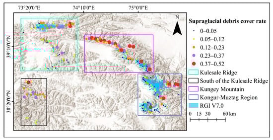 The supraglacial debris cover rate (the ratio of the debris-covered area to the glacier area) in eastern Pamir ranged from 0 to 0.52, with a mean value of 0.14. These results reflected the considerable spatial variability across the region. To further investigate this variability, the study area was delineated into four distinct regions based on the mountain ranges: Kulesale Ridge (KR), Kongur-Muztag Region (KMR), Kungey Mountain (KM), and south of the Kulesale Ridge (SKR). The results revealed considerable regional differences in the debris cover rate (Table 3, Figure 4): the KR generally demonstrated low coverage, although some areas exhibited higher coverage (range 0.41, average 0.12); the SKR had relatively uniform coverage, with a maximum of 0.48 and an average of 0.16; the central region not only exhibited high coverage (maximum 0.52, average 0.18) but also demonstrated the greatest spatial variability (range 0.52); the KMR, despite large areas being covered by debris, had low overall coverage (range 0.49, average 0.10). In summary, the KM exhibited the highest supraglacial debris cover rate and the greatest variation, followed by the SKR. The KR and KMR regions demonstrated relatively lower cover rates, highlighting the heterogeneity in the glacier dynamics and surface processes across these regions.