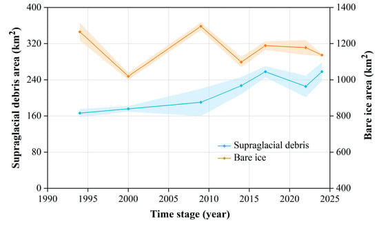 Trends in debris cover and bare ice area in eastern Pamir from 1994 to 2024.