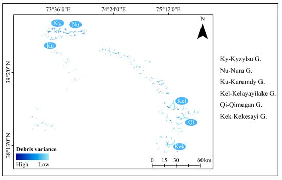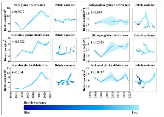 Trends of changes in the debris cover area of typical glaciers from 1994 to 2024 (k represents the average rate of change in debris-covered areas; “debris variance high” indicates significant changes in the extent of debris cover in that area, while “low” indicates no change in the extent of debris cover).
