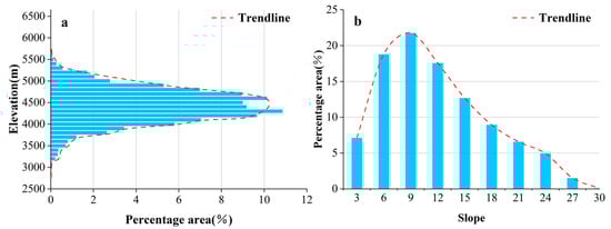 Proportion (%) of debris cover area changes under different (a) elevations and (b) slopes.