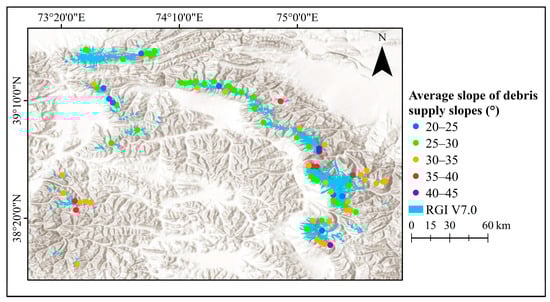 Glacier distribution map in the study area, showing 85 glaciers with data on the average debris supply slope (each point represents a glacier, with point colors indicating different average slope values).