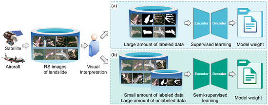 Different learning styles for landslide identification: (a) supervised learning; (b) semi-supervised learning.