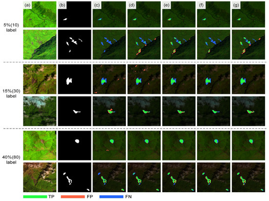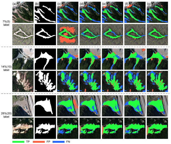 Typical visual results of landslide identification on the Sichuan dataset: (a) input image; (b) label; (c) SL; (d) Mean Teacher; (e) UniMatch; (f) U2PL; (g) HPM-Match.