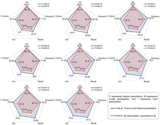 To assess the impact of different perturbation types on HPM-Match, an ablation experiment was conducted on the Bijie dataset, which had a labeling ratio of 2%. As depicted in Figure 10, the F0-M0-I0 combination yields the lowest IoU and F1-Score among all perturbation combinations, with reductions of 26.68% and 24.85%, respectively, compared to the best-performing F2-M1-I2 combination. This finding affirms that each perturbation type contributes positively to landslide identification. Moreover, the F1-M0-I0, F0-M1-I0, and F0-M0-I1 all improve the precision of the model in identifying landslides, albeit to varying degrees. This hierarchy arises from the fact that strong input perturbation supplies additional information to decouple self-biased cognition. Conversely, feature and model perturbations leverage perturbation-based internal discrepancies as update momentum to facilitate learning from unlabeled data. Both F2-M0-I0 and F0-M0-I2 outperform their respective single perturbations, indicating the effectiveness of DIP and two feedforward feature perturbations. However, the F3-M1-I2 and F2-M1-I3 combinations perform worse than F2-M1-I2, underscoring the limited significance of blindly adding perturbations, which only adds extra computational burden without substantial benefits.
