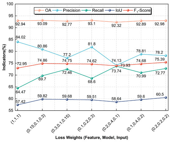 Performance metrics of final loss with different loss weights in the 2% labeled Bijie dataset.