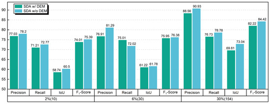 Excluding the DEM from the SDA approach led to improved performance metrics across all three labeling ratios. Notably, in the 30% labeling case, the IoU and F1-Score demonstrated maximum improvements of 3.23% and 2.2%, respectively. This improvement can be attributed to the fact that SDA destroys the original information of DEM, so the landslide geomorphological features are destroyed, such as scarp, rupture surface, and sliding body. This may impair the performance of the model.