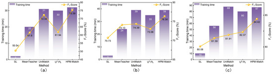 HPM-Match improves the accuracy of historical landslide identification under limited-label conditions but also increases the computational cost of the model. We evaluated the training time of HPM-Match, SL, and other SOTA SSL methods on the Bijie dataset, as shown in Figure 15. The results indicate that the training time of SSL methods is significantly higher than that of SL across all three label ratios. This is because SL only utilizes a small amount of labeled data for training and does not learn from unlabeled data. Among the four SSL methods, the Mean Teacher has the shortest training time but typically achieves the lowest F1-Score. While HPM-Match achieves the best performance, its longer training time poses a challenge for practical applications.