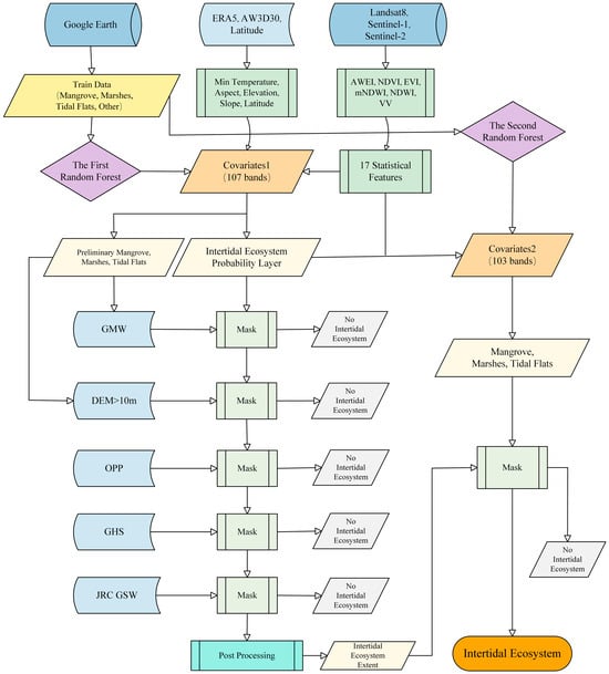 First, to eliminate misclassifications involving buildings and other artificial structures, we utilized the JRC/GHSL/P2023A/GHS_BUILT_C/2018 dataset (Global Human Settlement Layer), which provides comprehensive global information on residential and building distribution. By overlaying this dataset with our study imagery and spatially filtering out building-related pixels, we prevented the misclassification of urban and surrounding areas, where shadows or water reflections from buildings could otherwise be confused with intertidal water bodies or ecosystems. This step was especially crucial in high-density urban areas. Second, to ensure the accurate delineation of dynamic intertidal water bodies, we applied the JRC/GSW1_4/Monthly History dataset, specifically masking out pixels with 100% water occurrence frequency. This time-series dataset captures globally stable, permanent water bodies, allowing us to exclude high-frequency water pixels and avoid misclassification caused by shadows or transient water surfaces, thereby preventing permanent water bodies from being mistakenly classified as intertidal waters.