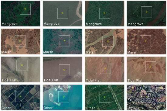 Figure 3) for selecting training samples were as follows: (i) distinct ecological features in the imagery that allow the clear identification of ecosystem types, such as mangroves, tidally submerged sediments, or marsh vegetation; (ii) samples located near well-defined natural coastlines with visible intertidal ecosystems in the imagery; (iii) samples confirmed by multi-temporal images from 2021 to 2023 to ensure ecosystem types remained stable. To improve the accuracy of interpreting complex ecosystem types, additional reference sources were consulted, including studies on China–ASEAN coastal wetlands, coastal atlases, and other publicly available datasets (e.g., Global Wetlands Database). These sources provided supplementary ecosystem characteristics, particularly enhancing interpretation accuracy in areas with similar vegetation types.