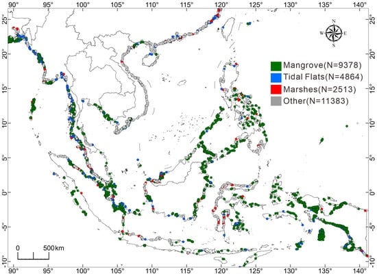 Figure 4), categorized into four classes: mangroves (8378), tidal flats (5864), salt marshes (2513), and other (11,383). Among these, tidal flats, salt marshes, and mangroves collectively constitute the intertidal ecosystem. The “other” category encompasses non-intertidal ecosystems, including deep and shallow marine systems such as seagrass meadows, kelp forests, and photic coral reefs, as well as various terrestrial land cover types like aquaculture zones, agricultural lands, residential areas, sandy coasts, and rocky shorelines. These regions span both the terrestrial ecosystems located above the mean high tide line and the aquatic ecosystems below it.