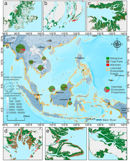 Figure 1) spans 26.60°N to 10.82°S and 89.19°E to 141.28°E, covering the ASEAN region, including the Indochina Peninsula and Malay Archipelago. Stretching across approximately 25,000 km of coastline, this region features diverse coastal landscapes, including rocky shores, sandy beaches, mangroves, and salt marshes. Hydrological processes, driven by tropical monsoons, influence salinity gradients, sedimentation patterns, and tidal regimes, while wave energy and sediment transport shape the formation of depositional environments and coastal features. These conditions shape intertidal zones and sustain the region’s ecological and geomorphological diversity.