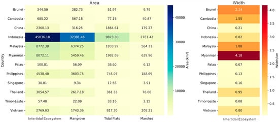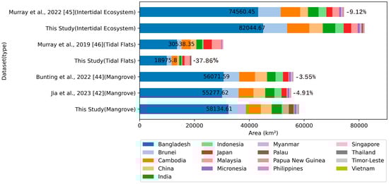 Figure 10) from multiple large-scale remote sensing mapping algorithms illustrate the area distribution of intertidal, tidal flat, and mangrove ecosystems across various countries. In this study, the estimated area of intertidal ecosystems is 82,044.67 km