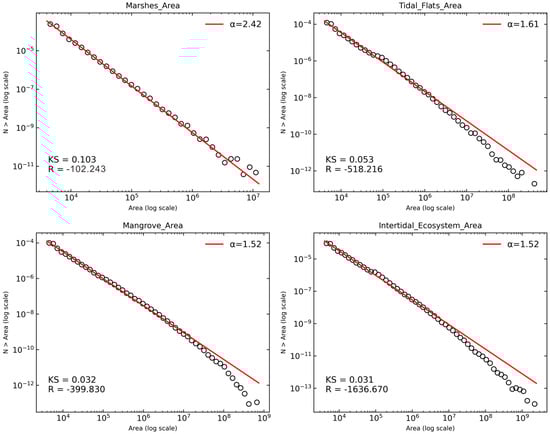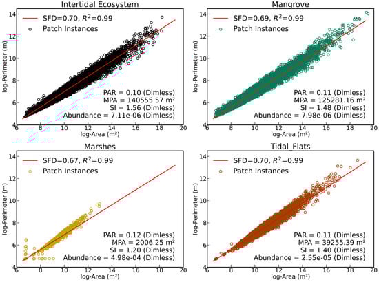 In this study, we employed power-law fitting and a regression analysis to examine the area–abundance and area–perimeter relationships of intertidal ecosystems and their sub-ecosystems (mangroves, salt marshes, and tidal flats) across the China–ASEAN region. First, we fitted the area and abundance of ecosystem patches in a log-log space to analyze their power-law distributions and validated the fit using the Kolmogorov–Smirnov (KS) test. Additionally, to explore the patch shape complexity and boundary characteristics, we analyzed the area–perimeter relationships in the log space and calculated shape complexity indices, including the Shape Fractal Dimension (SFD), perimeter–area ratio (PAR), mean patch area (MPA), shape index (SI), and patch abundance. These metrics quantified the boundary complexity and fragmentation of the patches, elucidating structural differences among sub-ecosystems within the landscape.