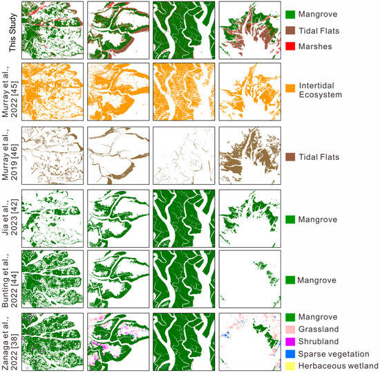 45] achieves substantial accuracy in large-scale intertidal mapping, it lacks fine distinctions within specific ecosystems, such as mangroves and tidal flats. By contrast, our dataset not only maintains a high overall classification accuracy but also distinctly differentiates detailed components within intertidal ecosystems. The Murray et al., 2019’s UQD [
