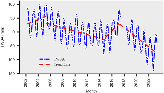 Since 2000, increased evapotranspiration, rising temperatures, and human interference have changed Central Asia’s water resources [20]. In the context of climate change and human activities, the water resources per capita in the five Central Asia countries were decreasing year by year. There were significant seasonal changes in TWSA in Central Asia (Figure 4); the peak was around April of each year, and the low value was around October of each year (Figure 4). That is, the total water storage in Central Asia in spring (March, April, May) is at its peak, while the total water storage in autumn (September, October, November) is at a trough, with significant losses. Comparing Figure 4 with Figure 3b demonstrates that the seasonality of the TWSA was consistent with precipitation, while TWSA lagged by a month. The quarterly dynamics of the water resources followed the variable precipitation. Monthly TWSA ranged from −139.17 mm to 101.32 mm, with a peak in April 2005 and a minimum in October 2022. From April 2002 to April 2005, TWSA showed an upward trend with a rate of 0.76 mm/month (p = 0.18). However, they showed a significant downward trend from April 2005 to December 2014 with a rate of −0.52 mm/month (p < 0.001). Then, from January 2015 to March 2017, it exhibited a significant upward trend with a change rate of 1.89 mm/month (p < 0.1). During April 2017~May 2023, TWSA in Central Asia displayed an obviously decreasing trend with a rate of −1.44 mm/month (p < 0.001). Since 2002, the Central Asian TWSA have fluctuated over time. Over the entire study period, the total regional water storage showed a significant downward trend with a rate of −3.53 mm/year (p < 0.001). Furthermore, there was a correlation between the decline in precipitation, increase in air temperature, and the reduction in Central Asia’s water resources.