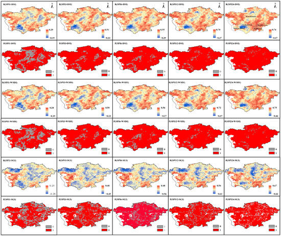 Spatial correlation coefficients between GRACE-DSI, WSDI, SGI, and SPI during 2002–2023. p stands for the significance of linear correlation, p = 0 represents no significant correlation, and p = 1 represents significant correlation.
