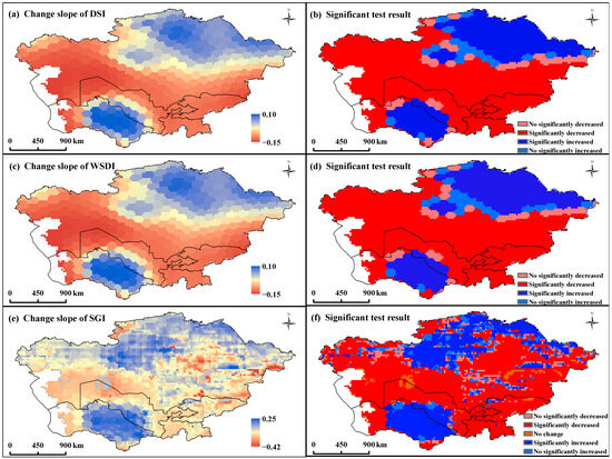 Monthly change rate of GRACE-DSI, GRACE-WSDI, and GRACE-SGI and their MK significance test results. (a) Change slope of GRACE-DSI, (b) Significant test result of GRACE_DSI, (c) Change slope of GRACE-WDSI, (d) Significant test result of GRACE_WDSI, (e) Change slope of GRACE-SGI, (f) Significant test result of GRACE_SGI.
