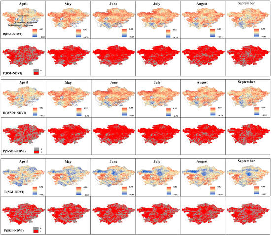 Correlation between the GRACE drought indicators (i.e., GRACE-DSI, GRACE-WSDI, GRACE-SGI) and the MODIS NDVI during the growing season (April–September). p stands for the significance of linear correlation, p = 0 represents no significant correlation, and p = 1 represents significant correlation.