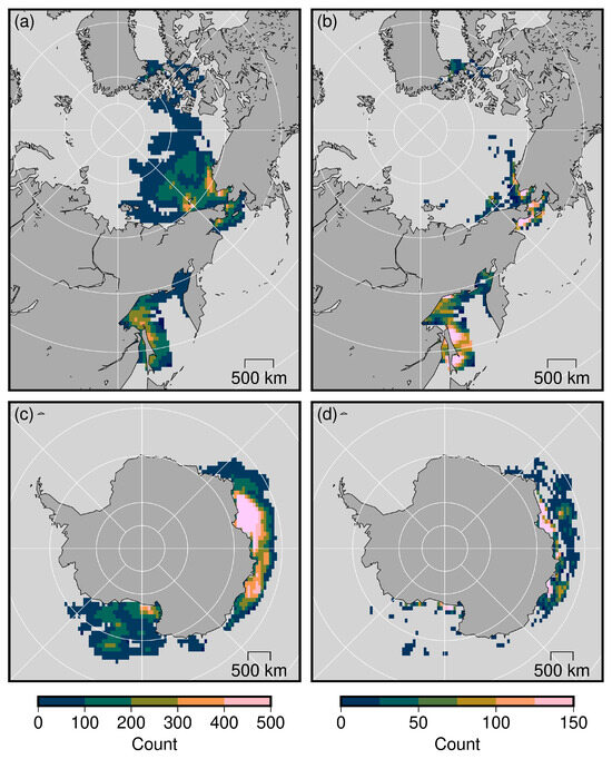 (a,c) Frequency map of all MODIS validation data points, and (b,d) frequency map of MODIS data points with ice thickness of <30 cm for the Northern (a,b) and Southern (c,d) Hemispheres.