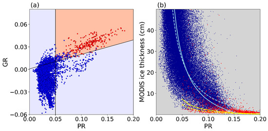 Scatterplots of (a) PR versus GR and (b) PR versus MODIS thickness. Red and blue marks indicate the data for active frazil and solid ice, respectively, in both panels (a,b). The ice types in Figure 3a,b are identified based on visual inspections of Sentinel-1 and Equation (2), respectively. The background colors in Figure 3a indicate the classification range of active frazil (red) and solid ice (blue) using the AMSR-E algorithm of Nakata et al. [25]. The solid and dashed lines in Figure 3b show the fitted exponential curves for active frazil (yellow) and thin solid ice (light blue) derived in this study and by Nakata et al. [25], respectively.