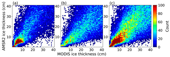 Two-dimensional histograms of AMSR2 versus MODIS ice thickness for the (a) Northern Hemisphere, (b) Southern Hemisphere, and (c) global ocean.