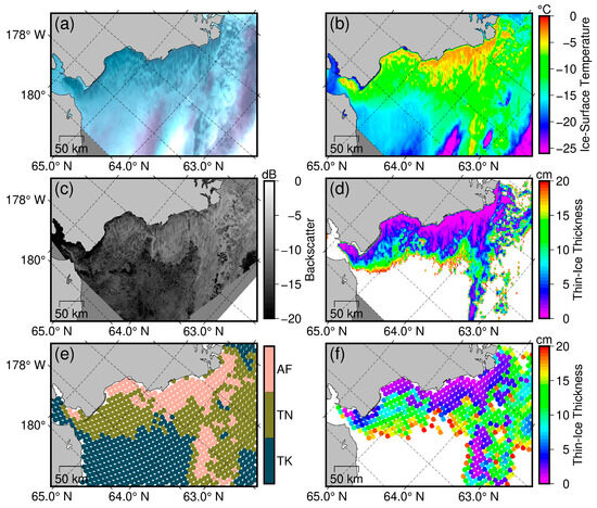 (a) MODIS visible image, and spatial distributions of (b) MODIS surface temperature, (c) Sentinel-1 SAR backscatter, (d) MODIS thin-ice thickness, (e) AMSR2 ice type (AF: active frazil, TN: thin solid ice, TK: thick solid ice), and (f) AMSR2 thin-ice thickness in Anadyr Bay, the Bering Sea, on 3 February 2022.