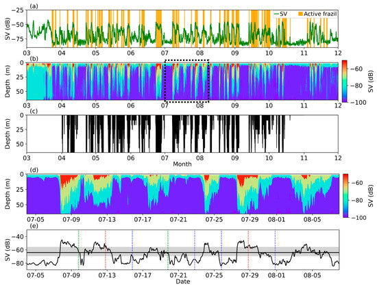 Time series of (a) ADCP backscatter strength (SV) at the uppermost bin (0–5 m depth) (green lines) and AMSR-E active frazil detection (yellow bar), (b) vertical profile of ADCP SV, and (c) penetration depth of frazil ice extracted from our method, from March to November 2010 off Cape Darnley, Antarctica. (d) Enlarged (July) time series of vertical profile and (e) surface (uppermost bin) ADCP SV. The dashed lines in (e) indicate the ASAR-interpreted sea-ice types (red: active frazil, blue: solid ice, green: boundary). Scale marks with month labels indicate the first day of each month.