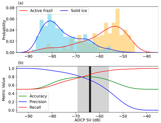 (a) Histogram of the ADCP SV for active frazil (orange) and solid ice (blue) detected by the AMSR algorithm, based on hourly averaged SV data from April to October. The red and blue lines indicate the kernel density estimates of the probability density distributions for the active frazil and solid ice. (b) “Recall”, “Precision”, and “Accuracy” of active frazil detection as a function of the threshold value of ADCP SV. The gray shading and black lines in (b) indicate the optimal threshold range and the boundary between active frazil and solid ice, respectively, inferred from the SAR images.