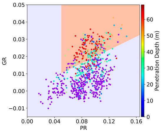 Scatterplots of PR versus GR colored by the penetration depth of frazil ice estimated from the vertical profile of the ADCP SV. The background colors indicate the classification ranges of active frazil (orange) and solid ice (purple) using the AMSR algorithm.