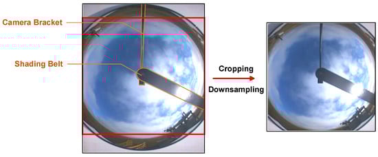 Preprocessing was performed on each cloud image in the original GBCSD, which mainly included extraction and cropping of the Region of Interest (ROI) and downsampling. The workflow diagram is illustrated in Figure 2. The cloud images depicted in the figures were captured by the TSI-880 and consisted of images of the hemispherical mirror sky, the sunshade, camera brackets, and ground scenery. Subsequently, the cropped images were downsampled. Due to the complexity of the spatiotemporal sequence prediction task and the substantial computational resource consumption, a pre-downsampling approach was adopted in this experiment to reduce the scale of model parameters and computation cycles. This helped to free up a certain amount of GPU memory space and facilitated the adjustment of more suitable training hyperparameters, such as batch size. Therefore, to maximize the efficiency of GPU computing power within a controllable range of cloud feature degradation, the initial cloud images were downsampled to 256 × 256 using a bicubic interpolation method. This approach allowed for the reduction in training costs while preserving the original cloud image information.
