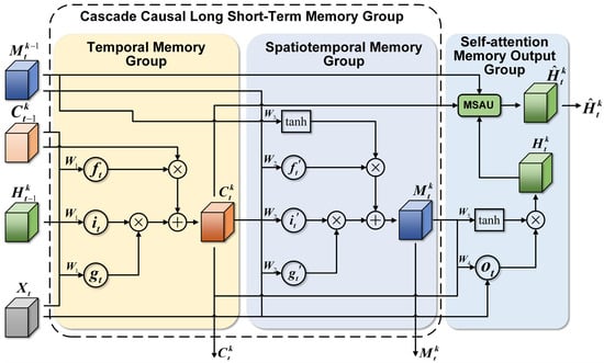The design inspiration of CCLSTM comes from adding more different nonlinear layers in recursive cycle transformations to increase the depth of the network from the current state to the next time step. It features a decoupled cascade of dual memory groups. As shown in Figure 3, the left yellow part represents the temporal memory group, the middle deep blue part represents the spatiotemporal memory group; additionally, the right light blue part represents the self-attention memory output group.