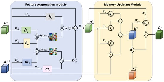 Then, the weighted sum operation is used to calculate the attention scores between each feature map in and all feature maps in . All dimensions of are concatenated to obtain the attention level of all feature information of to the spatiotemporal memory state. The dimension transformation operation is used to obtain with the same dimension as , and the calculation formula is defined as follows:
