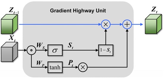 As the network deepens, the gradient propagation channels also strengthen. We embed the GHU layer in the hierarchical stacked deep spatiotemporal model to alleviate the problem of vanishing gradients in long-term dependency transmission. The complete system architecture is shown in Figure 7. The blue lines represent the gradient highway propagation paths directly connecting the current time step with the input from the previous time step. The orange lines represent the spatial–temporal memory transmission paths. The red lines represent the skip connections between the input and output of the gradient highway unit. Dashed lines indicate connections to subsequent units that are not drawn.