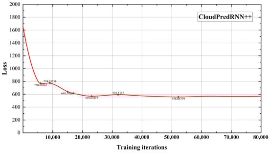 Therefore, under the conditions of experimental equipment and reasonable training time, this paper designs the most suitable multi-layer recursive cloud dynamics’ prediction model architecture, namely a 5-layer vertically stacked recursive architecture (as marked in Figure 7, L = 5). It consists of three layers of CDFMU and two layers of GHUs, with the number of channels set to 64, 64, 32, 32, and 32, respectively. The size of the convolutional filter in all recurrent units in the model is set to 5 × 5.