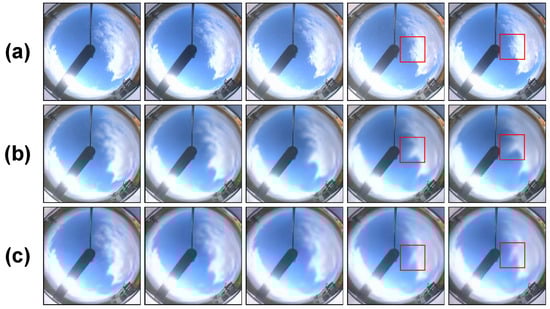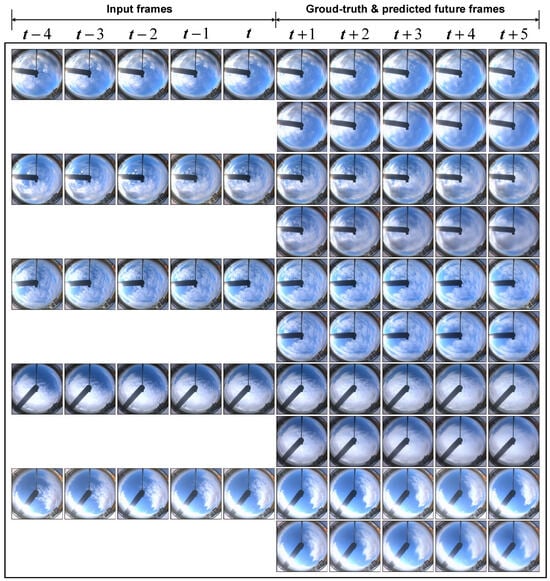 The prediction of future frame cloud images is based on sufficient observation of historical cloud images. Both the input sequence and output sequence of ground-based cloud images are set to 10, meaning that after observing a total time span of 10 min of historical frame ground-based cloud images, predictions are made for the future 10 frames, with an interval of 1 min, totaling 10 min. Figure 9 displays the 5th to 15th frames of ground-based cloud images for five samples. Assuming the current time step is t, the first row of each sample displays the historical frames of clouds from t-4 to t on the left and the true frames of clouds from t + 1 to t + 5 on the right. The corresponding positions in the second row show the predicted cloud images from t + 1 to t + 5.