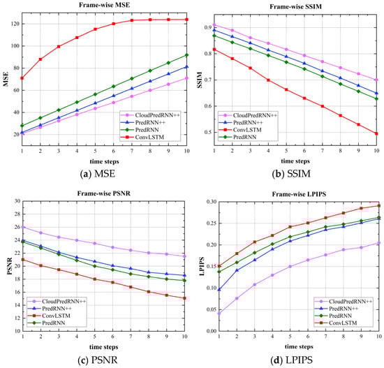 To further intuitively and comprehensively compare the cloud dynamics’ prediction performance among the four different models, curves for the MSE, SSIM, PSNR, and LIPIS evaluation metrics were plotted separately to demonstrate the predictive performance of each frame of ground-based cloud images. As shown in Figure 10, it illustrates the per-frame prediction performance curves of different models on the GBCSD, where (a) represents the MSE curve, (b) represents the SSIM curve, (c) represents the PSNR curve, and (d) represents the LPIPS curve.